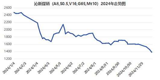 多數(shù)煤種已跌破年內(nèi)新低,其中離柳集團(tuán)高硫主焦公路(A10.5,S3,V25,G85,Y15,MT12)12月25日競(jìng)拍成交價(jià)1061元/噸,破年內(nèi)新低,較1月底2130元/噸已經(jīng)腰斬;沁新煤銷低硫主焦(A8,S0.5,V16,G65,Mt10)12月25日競(jìng)拍成交價(jià)1380元/噸,也已破年內(nèi)新低,較1月初2470元/噸也降價(jià)超千元。