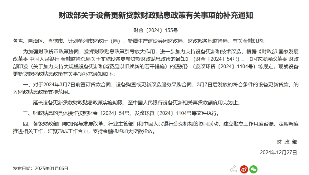 財政部日前發(fā)布關(guān)于設(shè)備更新貸款財政貼息政策有關(guān)事項的補充通知,其中提出,對于2024年3月7日前簽訂貸款合同、設(shè)備購置或更新改造服務(wù)采購合同,3月7日后發(fā)放的符合條件的設(shè)備更新貸款,納入財政貼息政策支持范圍。延長設(shè)備更新貸款財政貼息政策實施期限,至中國人民銀行設(shè)備更新相關(guān)再貸款額度用完為止。