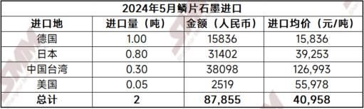 2024年5月,中國鱗片石墨進口量為2噸,環(huán)比暴跌100%,同比減少100%。