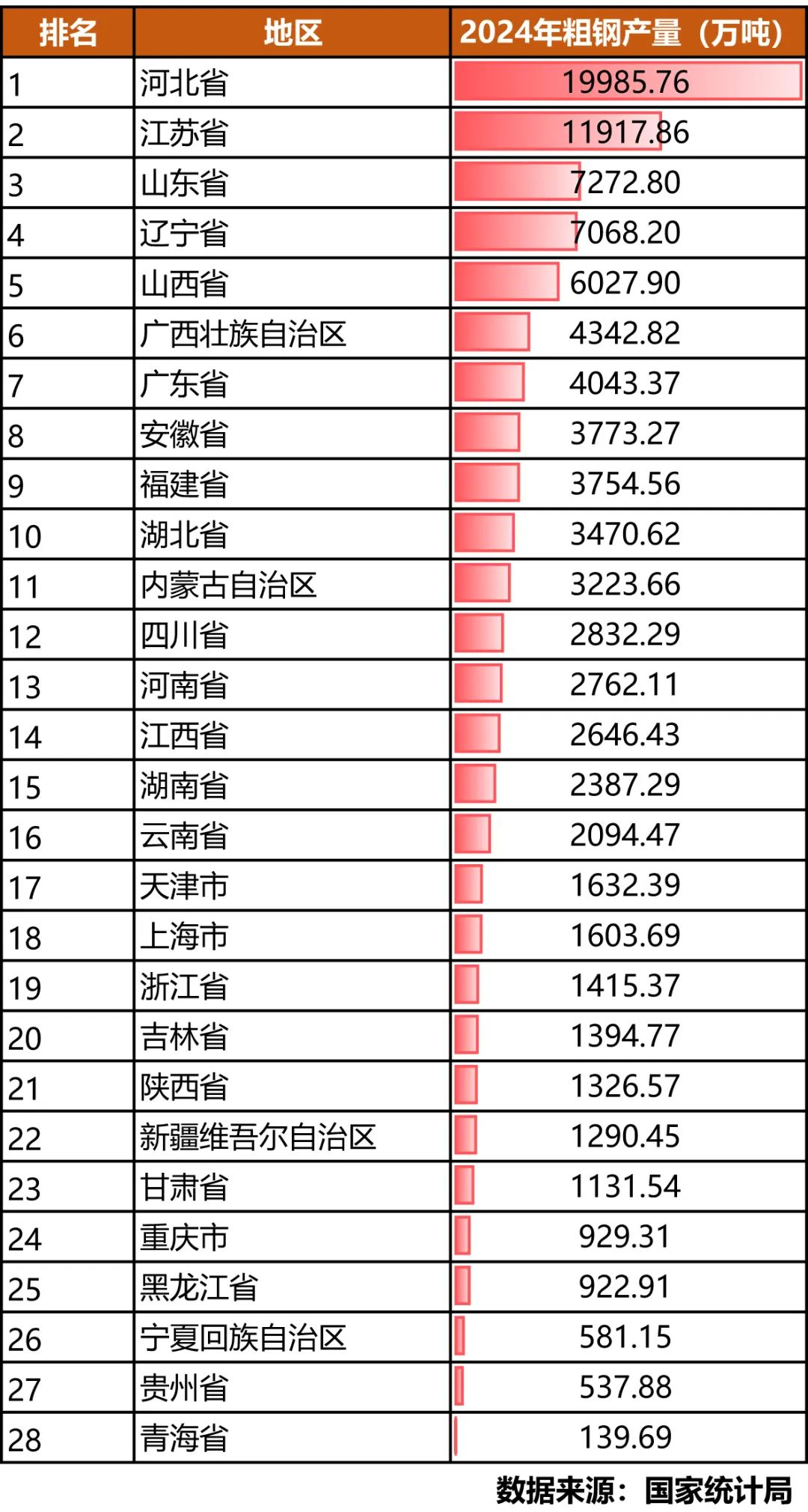 據國家統(tǒng)計局數據,2024年粗鋼產量前10省份依次為河北、江蘇、山東、遼寧、山西、廣西、廣東、安徽、福建、湖北。