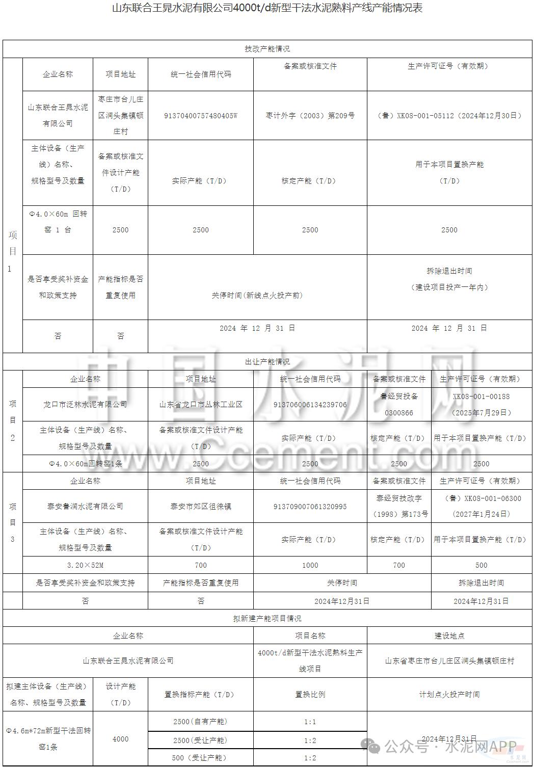 根據(jù)山東工信廳發(fā)布,山東聯(lián)合王晁水泥有限公司4000t/d熟料項(xiàng)目產(chǎn)能置換項(xiàng)目如下:
