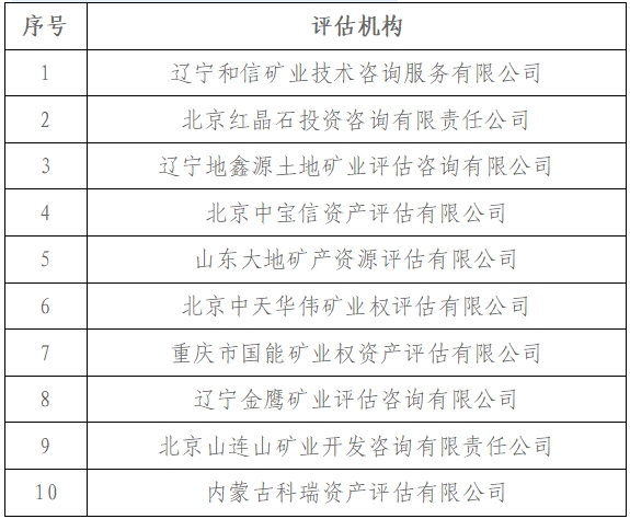 按照《遼寧省自然資源廳關(guān)于公開遴選礦業(yè)權(quán)出讓收益評估機(jī)構(gòu)的公告》要求,經(jīng)綜合評定,確定入圍機(jī)構(gòu)名單如下,特此公告。