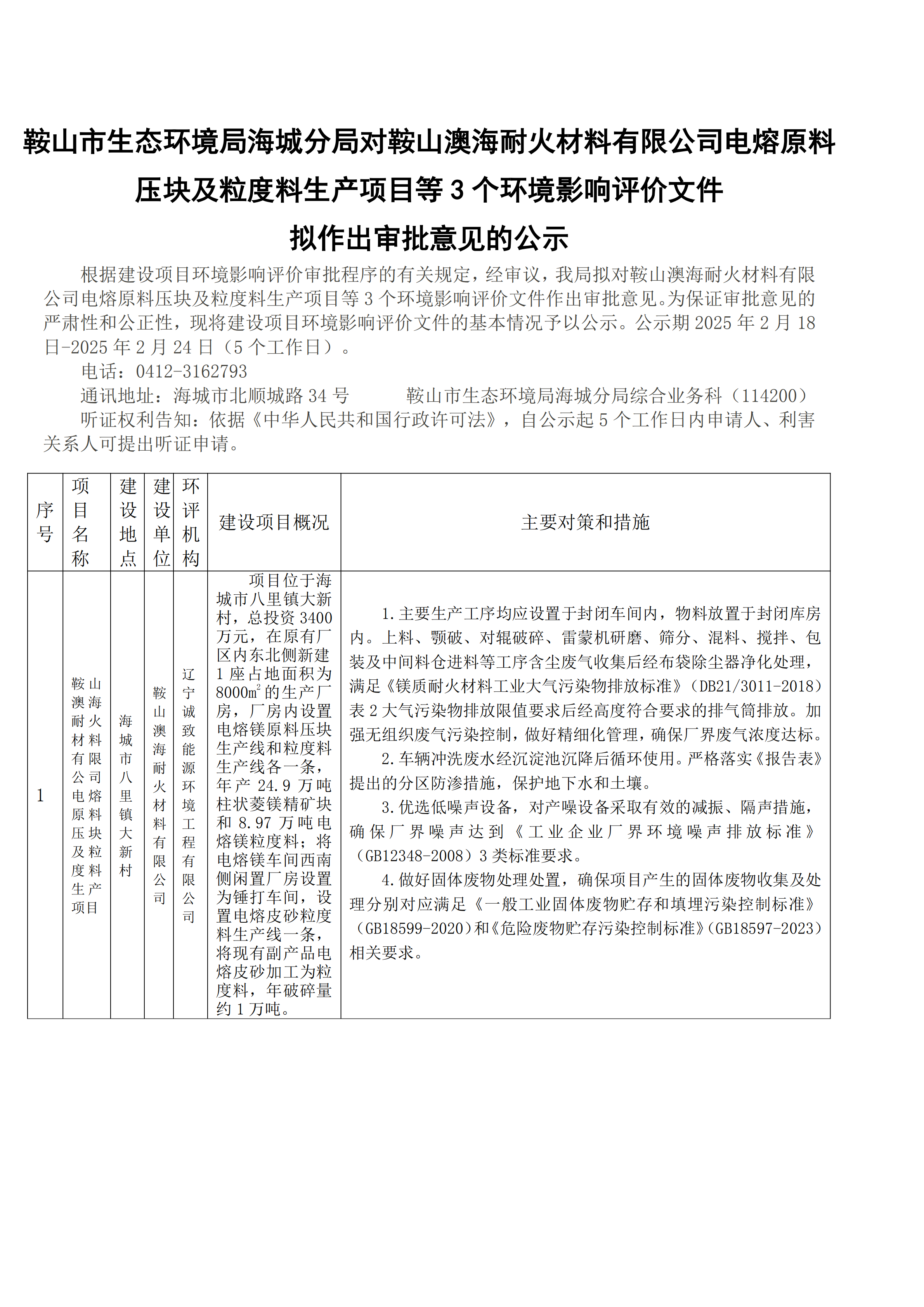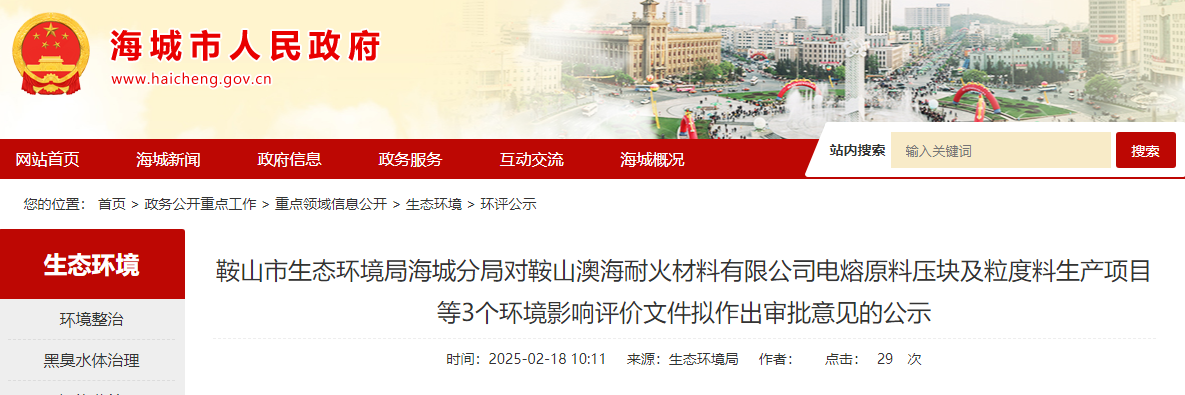 海城生態(tài)環(huán)境局對(duì)鞍山澳海耐火材料有限公司電熔原料壓塊及粒度料生產(chǎn)項(xiàng)目等3個(gè)環(huán)境影響評(píng)價(jià)文件擬作出審批意見(jiàn)的公示