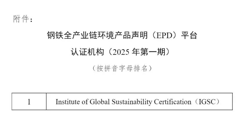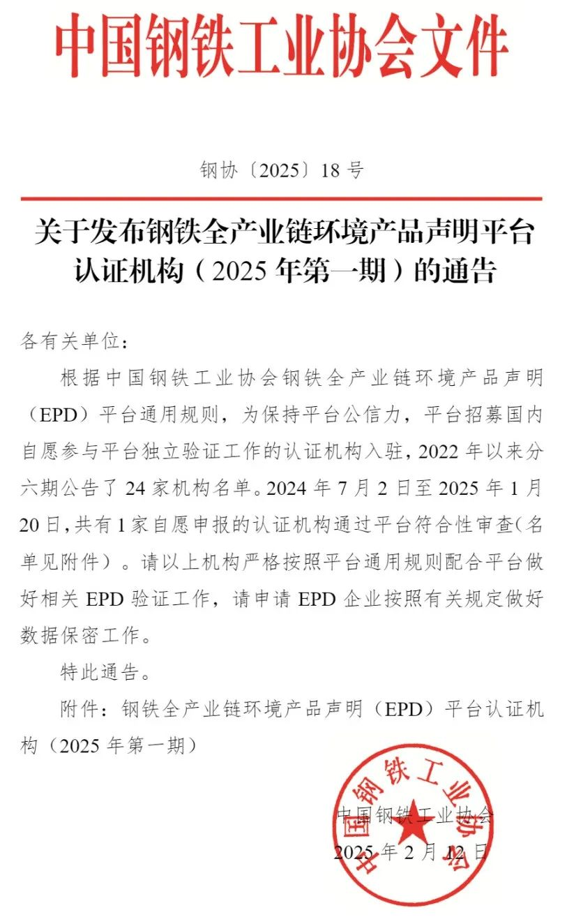 關于發(fā)布鋼鐵全產(chǎn)業(yè)鏈環(huán)境產(chǎn)品聲明平臺認證機構(2025年第一期)的通告