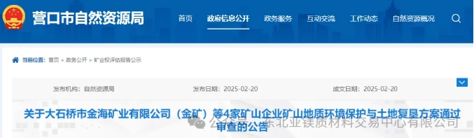 根據(jù)《國(guó)土資源部辦公廳關(guān)于做好礦山地質(zhì)環(huán)境保護(hù)與土地復(fù)墾方案編報(bào)有關(guān)工作的通知》(國(guó)土資規(guī)〔2016〕21號(hào))和《轉(zhuǎn)發(fā)國(guó)土資源部辦公廳關(guān)于做好礦山地質(zhì)環(huán)境保護(hù)與土地復(fù)墾方案編報(bào)有關(guān)工作的通知》(遼國(guó)土資辦發(fā)〔2017〕88號(hào))有關(guān)要求,大石橋市金海礦業(yè)有限公司(金礦)、大石橋市大嶺滑石十五礦有限公司(滑石、菱鎂礦)、大石橋秀才溝鐵礦有限公司、營(yíng)口瑞祥礦業(yè)有限公司(菱鎂礦)等4家礦山企業(yè)礦山地質(zhì)環(huán)境保護(hù)與土地復(fù)墾方案通過審查,現(xiàn)予公告。
