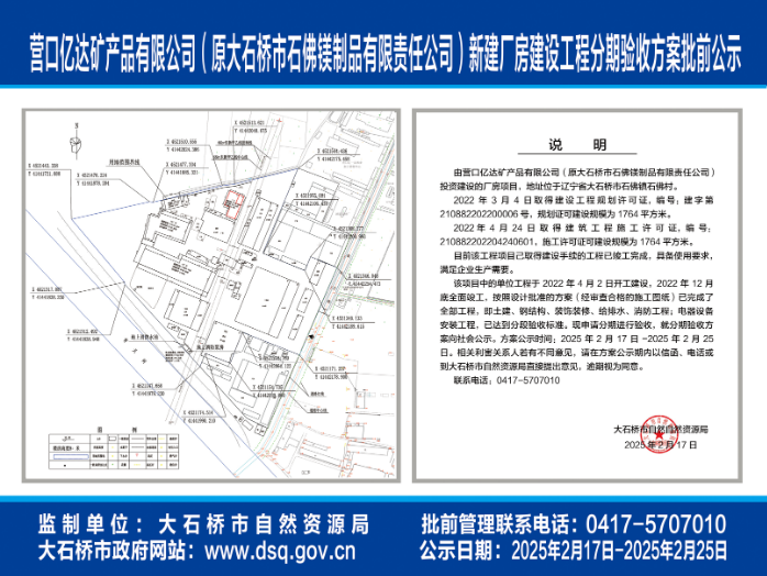 營(yíng)口億達(dá)礦產(chǎn)品有限公司(原大石橋市石佛鎂制品有限責(zé)任公司)新建廠房建設(shè)工程分期驗(yàn)收方案批前公示