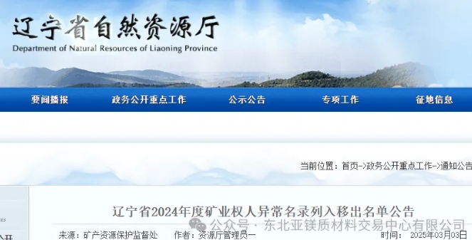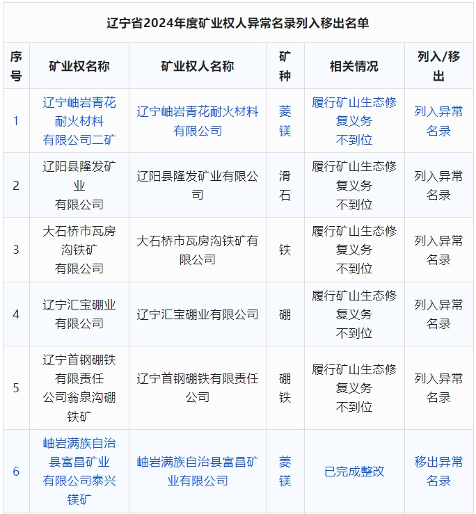 按照《礦業(yè)權(quán)人勘查開采信息管理辦法》(自然資源部令第13號(hào))《自然資源部辦公廳關(guān)于做好2024年礦業(yè)權(quán)人勘查開采信息公示工作的通知》(自然資辦函〔2024〕213號(hào))等要求,我省開展了礦業(yè)權(quán)人信息管理實(shí)地核查工作。根據(jù)核查結(jié)果,對(duì)擬列入、移出異常名錄的名單進(jìn)行了公示?,F(xiàn)公示期滿,決定將遼寧岫巖青花耐火材料有限公司二礦等5個(gè)礦業(yè)權(quán)列入異常名錄,將岫巖滿族自治縣富昌礦業(yè)有限公司泰興鎂礦等4個(gè)礦業(yè)權(quán)移出異常名錄(詳細(xì)名單見附件)。特此公告。