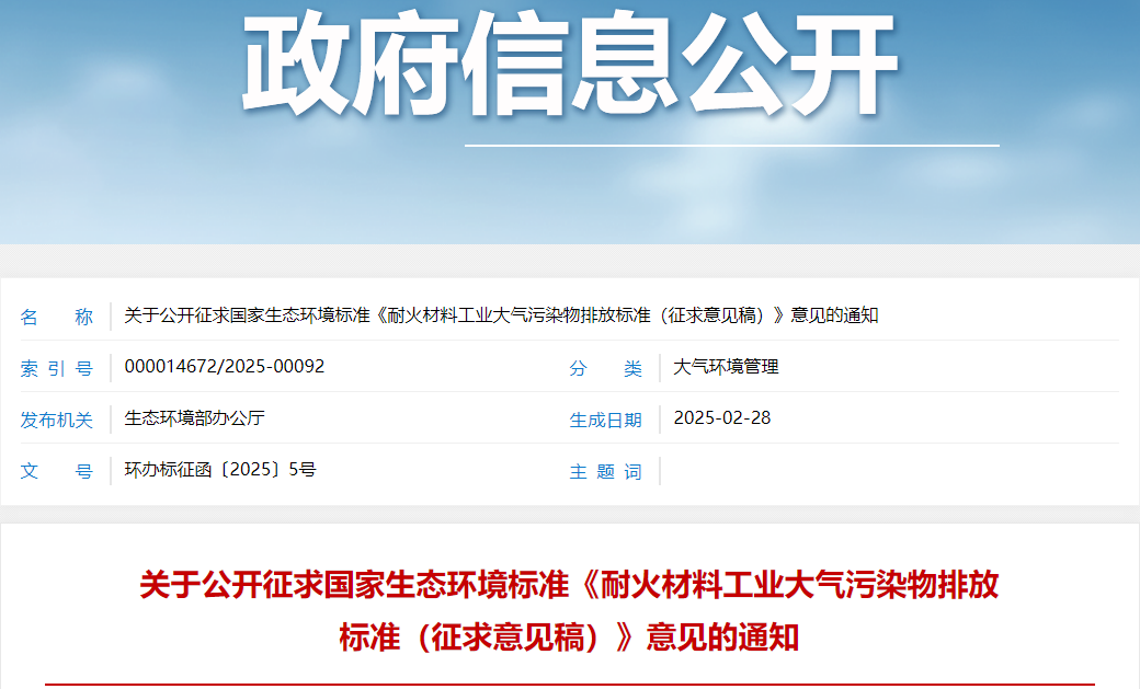 為貫徹《中華人民共和國環(huán)境保護(hù)法》和《中華人民共和國大氣污染防治法》,完善國家大氣污染物排放標(biāo)準(zhǔn)體系,促進(jìn)環(huán)境空氣質(zhì)量改善,我部組織編制了國家生態(tài)環(huán)境標(biāo)準(zhǔn)《耐火材料工業(yè)大氣污染物排放標(biāo)準(zhǔn)(征求意見稿)》,現(xiàn)公開征求意見。征求意見稿和編制說明可在我部網(wǎng)站(http://www.mee.gov.cn/)“意見征集”欄目檢索查閱。