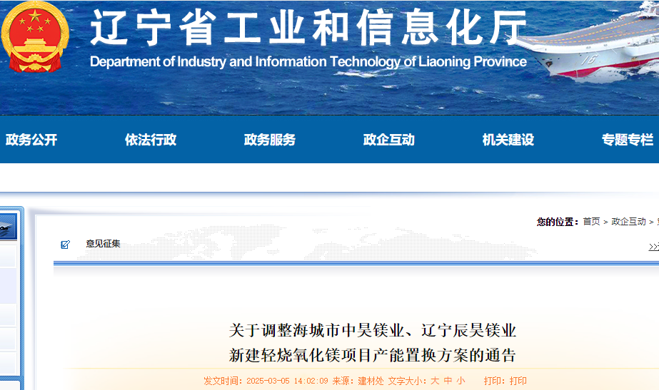按照《遼寧省人民政府辦公廳關(guān)于推進(jìn)菱鎂行業(yè)高質(zhì)量發(fā)展的實(shí)施意見》(遼政辦發(fā)〔2023〕15號(hào))、《遼寧省菱鎂礦浮選及鎂砂行業(yè)產(chǎn)能置換辦法》(遼工信建材〔2024〕18號(hào))要求,根據(jù)企業(yè)申請(qǐng)、鞍山市初審和申請(qǐng),因建設(shè)內(nèi)容、建設(shè)地點(diǎn)等項(xiàng)目?jī)?nèi)容變更,對(duì)海城市中昊鎂業(yè)有限公司、遼寧辰昊鎂業(yè)有限公司新建輕燒氧化鎂項(xiàng)目產(chǎn)能置換方案進(jìn)行調(diào)整,現(xiàn)對(duì)調(diào)整后的產(chǎn)能置換方案重新予以通告。