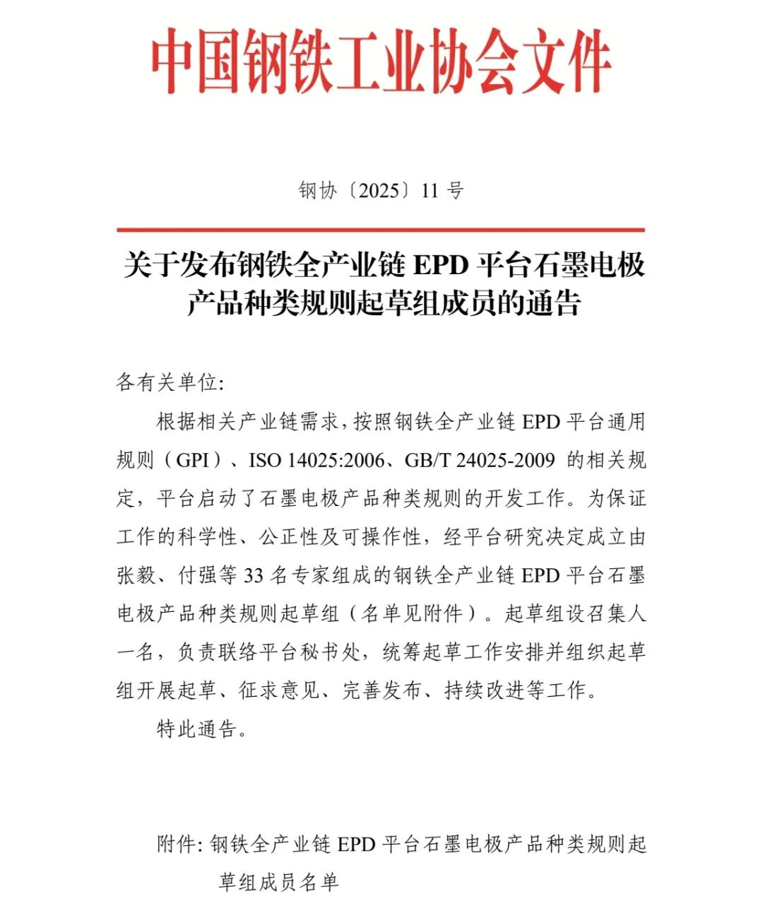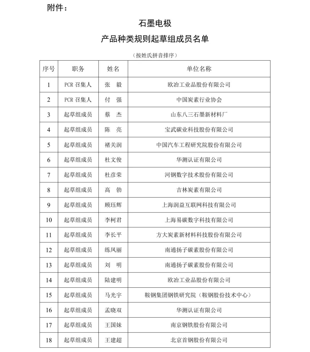 關于發(fā)布鋼鐵全產業(yè)鏈EPD平臺石墨電極產品種類規(guī)則起草組成員的通告