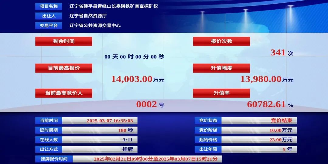 3月7日,遼寧省自然資源廳1月委托省公共資源交易中心網(wǎng)上掛牌出讓的32宗探礦權(quán)進(jìn)入競(jìng)拍交易第二天。當(dāng)日,10宗探礦權(quán)成功出讓,總價(jià)達(dá)2.2億元。其中,“遼寧省建平縣青峰山長(zhǎng)皋磷鐵礦普查探礦權(quán)”勘查面積2.2734平方公里,掛牌起始價(jià)23萬(wàn)元,經(jīng)過341輪激烈競(jìng)價(jià),最終以1.4億元成交。