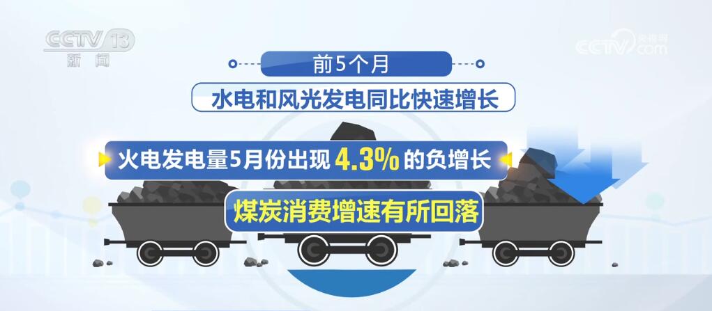 前5個月,水電和風光發(fā)電同比快速增長,也讓火電發(fā)電量在5月份出現(xiàn)了4.3%的負增長,煤炭消費增速有所回落。