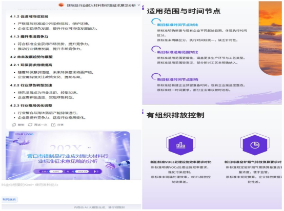 同時,隨著人工智能技術(shù)的飛速發(fā)展,人工智能AI在生態(tài)環(huán)境領(lǐng)域展現(xiàn)出巨大潛力。為推進(jìn)智能AI在生態(tài)環(huán)境領(lǐng)域的應(yīng)用,探索環(huán)境監(jiān)管工作中創(chuàng)新前沿,發(fā)揮DeepSeek、Kimi等人工智能系統(tǒng)驅(qū)動力量,市生態(tài)環(huán)境局依靠DeepSeek在數(shù)據(jù)處理、模式識別、預(yù)測分析等方面具有獨特優(yōu)勢,成功交互并生成《營口市鎂制品行業(yè)應(yīng)對耐火材料行業(yè)標(biāo)準(zhǔn)征求意見稿的分析》演示文稿,對我市耐火材料行業(yè)進(jìn)行深入思考,呈現(xiàn)多方面、多維度、多細(xì)節(jié)的工作思維導(dǎo)圖,所含內(nèi)容與我市生態(tài)環(huán)境治理需求高度契合,為生態(tài)環(huán)境監(jiān)管工作帶來的巨大變革潛力。