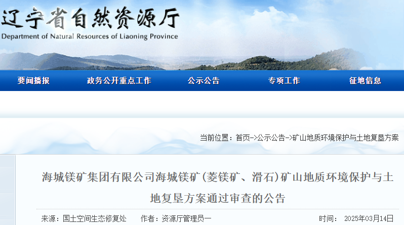 根據(jù)《國土資源部辦公廳關(guān)于做好礦山地質(zhì)環(huán)境保護與土地復(fù)墾方案編報有關(guān)工作的通知》(國土資規(guī)〔2016〕21號)和《關(guān)于印發(fā)礦山地質(zhì)環(huán)境保護與土地復(fù)墾方案省級審查管理辦法(試行)的通知》(遼自然資發(fā)〔2022〕129號)有關(guān)要求,海城鎂礦集團有限公司海城鎂礦(菱鎂礦、滑石)礦山地質(zhì)環(huán)境保護與土地復(fù)墾方案通過審查,現(xiàn)予公告。