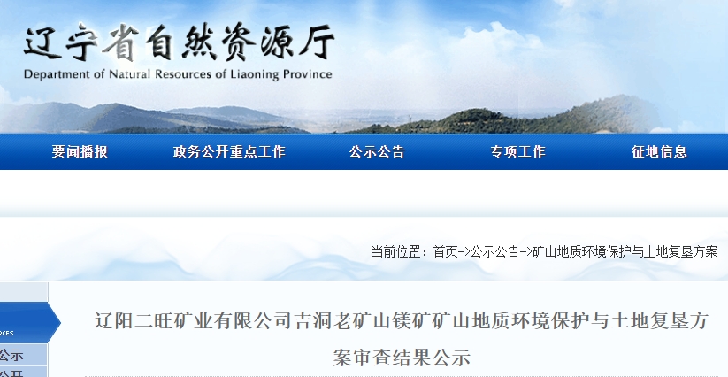 根據(jù)《國土資源部辦公廳關(guān)于做好礦山地質(zhì)環(huán)境保護(hù)與土地復(fù)墾方案編報有關(guān)工作的通知》(國土資規(guī)〔2016〕21號)和關(guān)于印發(fā)《礦山地質(zhì)環(huán)境保護(hù)與土地復(fù)墾方案省級審查管理辦法(試行)》的通知(遼自然資發(fā)〔2022〕129號)有關(guān)要求,我廳委托自然資源事務(wù)服務(wù)中心組織專家對遼陽二旺礦業(yè)有限公司吉洞老礦山鎂礦礦山地質(zhì)環(huán)境與土地復(fù)墾方案進(jìn)行了審查。現(xiàn)將擬同意通過的該方案及專家評審意見進(jìn)行公示,公示期自發(fā)布之日起7個工作日。
