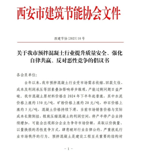 近日,西安市建筑節(jié)能協(xié)會(huì)發(fā)布“關(guān)于我市預(yù)拌混凝土行業(yè)提升質(zhì)量安全、強(qiáng)化自律、反對(duì)惡性競(jìng)爭(zhēng)的倡議書”。