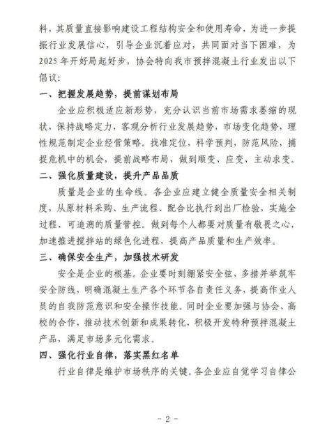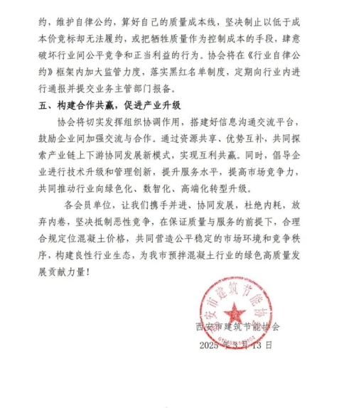 去年以來,西安市預(yù)拌混凝土行業(yè)受市場(chǎng)需求收縮、回款欠佳、成本及利潤承壓等因素疊加影響舉步維艱,產(chǎn)能過剩問題日益嚴(yán)峻。西安市混凝土原材料價(jià)格自2024年下半年起普漲,其中水泥價(jià)格上漲約150元/噸,礦粉價(jià)格上漲約20元/噸,砂石價(jià)格上漲約5元/噸,混凝土價(jià)格持續(xù)下滑,當(dāng)前市場(chǎng)銷售價(jià)格與實(shí)際成本長期倒掛,極致壓縮混凝土的利潤空間,停產(chǎn)半停產(chǎn)企業(yè)持續(xù)增加,可能會(huì)出現(xiàn)部分企業(yè)為爭(zhēng)奪市場(chǎng)份額,采取以價(jià)換量、以量換損的惡性競(jìng)爭(zhēng)方式,肆意破壞行業(yè)自律公約,嚴(yán)重?cái)_亂行業(yè)市場(chǎng)秩序的行為。