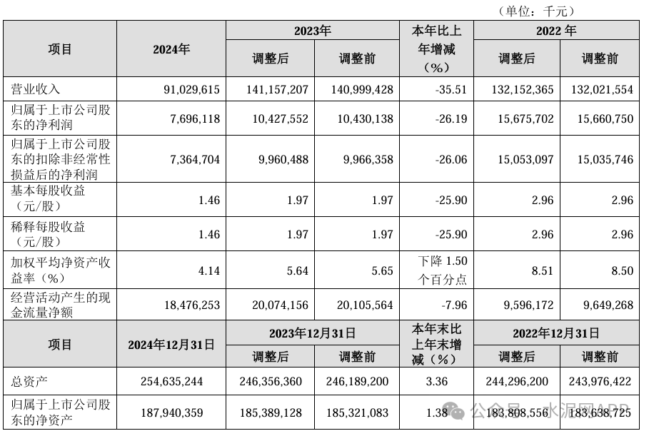 3月24日,海螺水泥公告稱,2024年實(shí)現(xiàn)營(yíng)業(yè)收入910.3億元,同比下降35.51%;歸屬于上市公司股東的凈利潤(rùn)為76.96億元,同比下降26.19%。公司擬每股派發(fā)現(xiàn)金紅利0.71元人民幣(含稅),不實(shí)施公積金轉(zhuǎn)增股本。報(bào)告期內(nèi),本集團(tuán)增加熟料產(chǎn)能230萬噸(海外),通過遷建等方式新增水泥產(chǎn)能800萬噸,新增骨料產(chǎn)能1,450萬噸、商品混凝土產(chǎn)能1,210萬立方米、光儲(chǔ)發(fā)電裝機(jī)容量103兆瓦。截至報(bào)告期末,本集團(tuán)擁有熟料產(chǎn)能2.74億噸,水泥產(chǎn)能4.03億噸,骨料產(chǎn)能1.63億噸,在運(yùn)行商品混凝土產(chǎn)能5,190萬立方米,在運(yùn)行光儲(chǔ)發(fā)電裝機(jī)容量645兆瓦。
