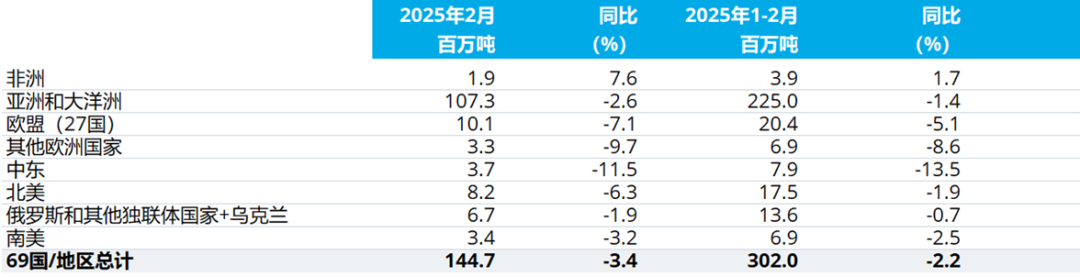 2025年2月全球69個(gè)納入世界鋼鐵協(xié)會(huì)統(tǒng)計(jì)國(guó)家/地區(qū)的粗鋼產(chǎn)量為1.447億噸,同比下降3.4%。