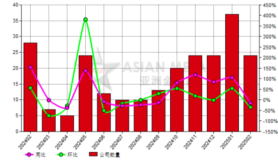 2025年1-2月,24家生產(chǎn)商共計(jì)生產(chǎn)1,200.00公噸,平均開工率0.16%。