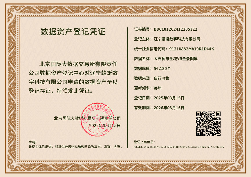 近日,大石橋市數(shù)字經(jīng)濟(jì)發(fā)展取得關(guān)鍵階段性成果——《大石橋市全域VR全景圖集》獲得北數(shù)所(北京國(guó)際大數(shù)據(jù)交易所)頒發(fā)的營(yíng)口地區(qū)首張數(shù)據(jù)資產(chǎn)登記證書(編號(hào):BD0101202412205322),成為遼寧省首個(gè)縣域級(jí)三維實(shí)景數(shù)字名片。這一里程碑標(biāo)志著我市數(shù)據(jù)資產(chǎn)入表工作邁出堅(jiān)實(shí)一步,為數(shù)字產(chǎn)業(yè)升級(jí)、新質(zhì)生產(chǎn)力培育及低空經(jīng)濟(jì)發(fā)展探索出創(chuàng)新路徑。
