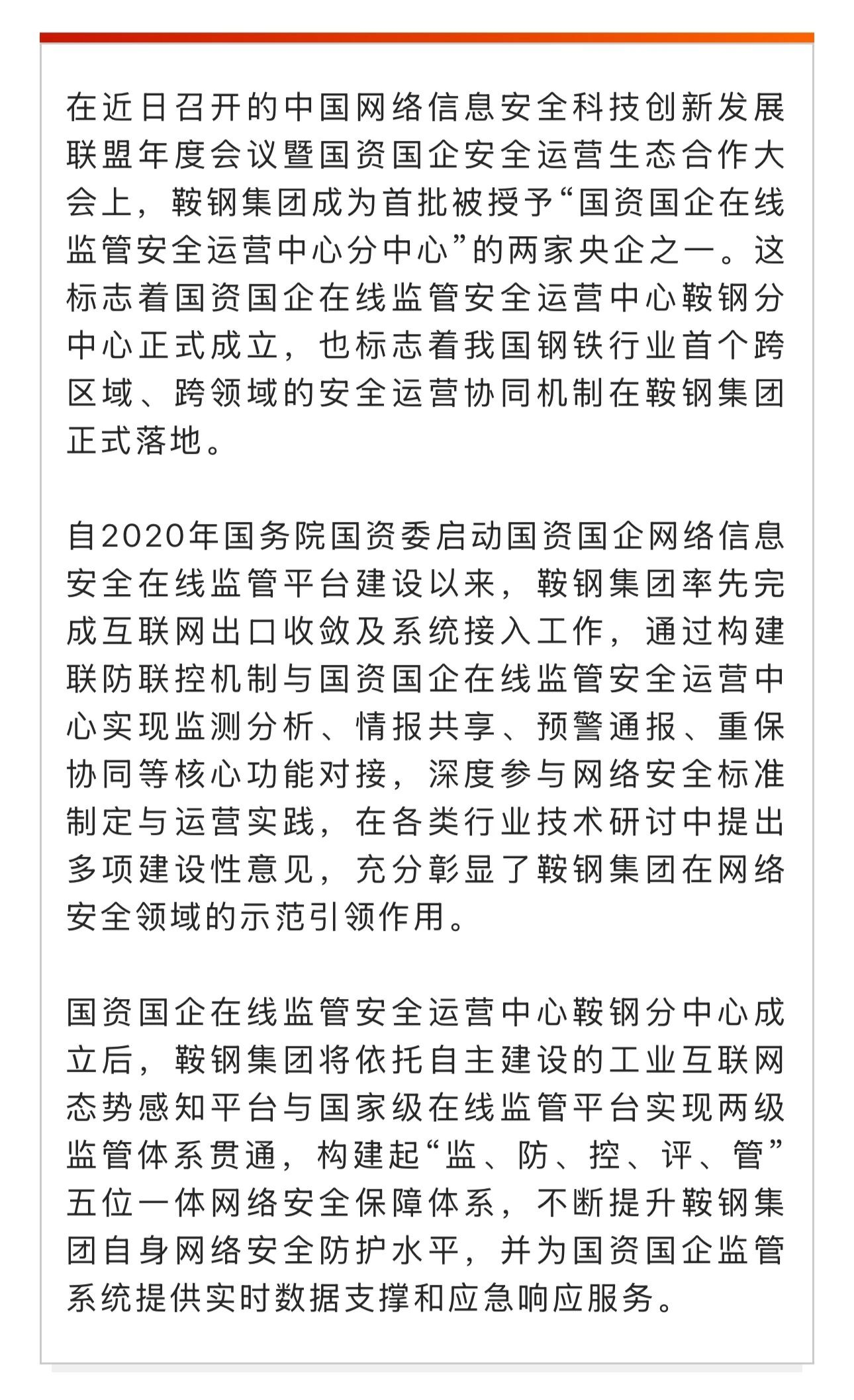 國(guó)資國(guó)企在線監(jiān)管安全運(yùn)營(yíng)中心鞍鋼分中心成立