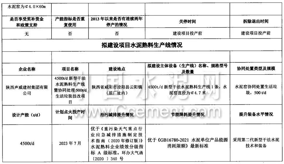 據(jù)悉,4月2日陜西聲威建材有限公司4500t/d熟料水泥生產(chǎn)線成功點(diǎn)火,并于4月5日順利投料成功。水泥網(wǎng)了解到,陜西聲威建材集團(tuán)有限公司投資建設(shè)的日產(chǎn)4500噸新型干法熟料生產(chǎn)線技改項(xiàng)目于2022年8月開工,總投資9.271億元,建設(shè)新型智能化水泥熟料生產(chǎn)線,采用二代智能化新型干法預(yù)分解生產(chǎn)工藝,配套建設(shè)9MW純低溫余熱發(fā)電等高科技環(huán)保項(xiàng)目,項(xiàng)目達(dá)產(chǎn)后將實(shí)現(xiàn)產(chǎn)值不低于6億元,年均利潤總額1.6億元,稅收0.8億元,帶動就業(yè)400余人。產(chǎn)能置換項(xiàng)目如下: