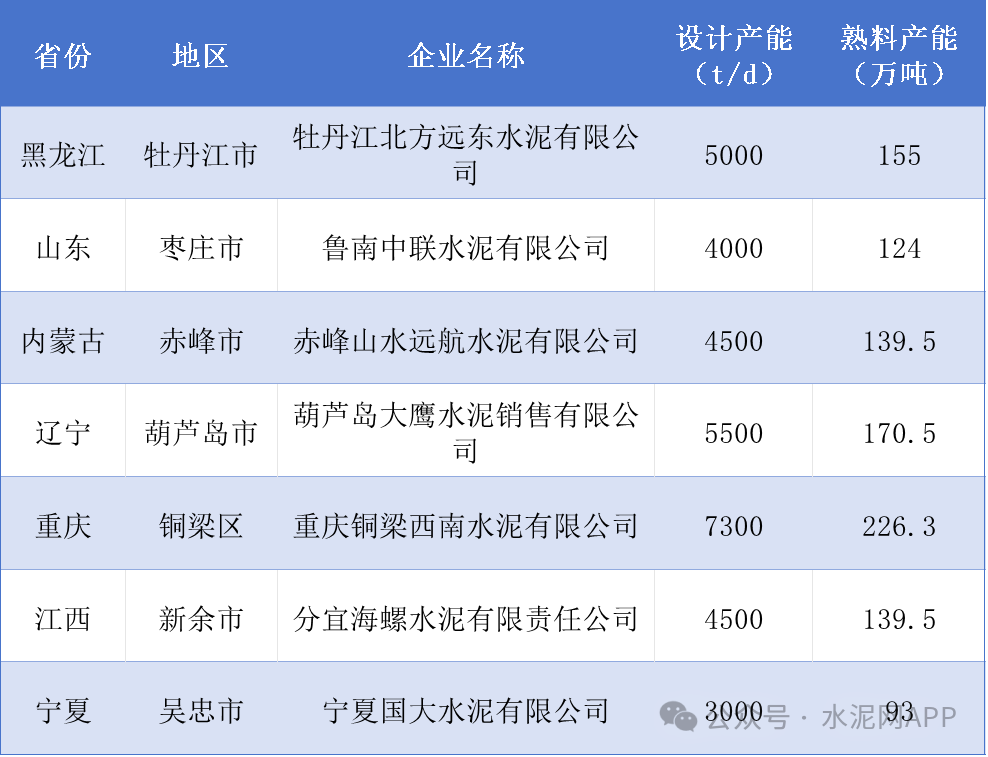 據(jù)中國水泥網(wǎng)水泥大數(shù)據(jù)研究院統(tǒng)計(jì),當(dāng)前在建熟料生產(chǎn)線產(chǎn)能2271.2萬噸,其中預(yù)計(jì)2025投產(chǎn)生產(chǎn)線8條,產(chǎn)能近1200萬噸,除去陜西聲威建材集團(tuán)4500t/d線已投產(chǎn),預(yù)計(jì)今年還有7條熟料生產(chǎn)線將投產(chǎn):
