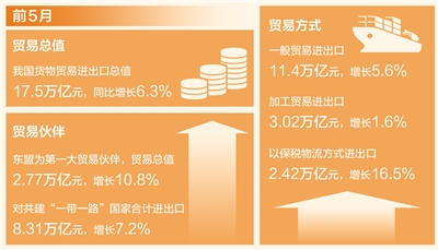 我國外貿(mào)前5月成績(jī)單近日出爐,貨物貿(mào)易進(jìn)出口總值同比增長6.3%。其中,出口增長6.1%,進(jìn)口增長6.4%。5月當(dāng)月,進(jìn)出口同比增長8.6%,出口增長11.2%,進(jìn)口增長5.2%。
