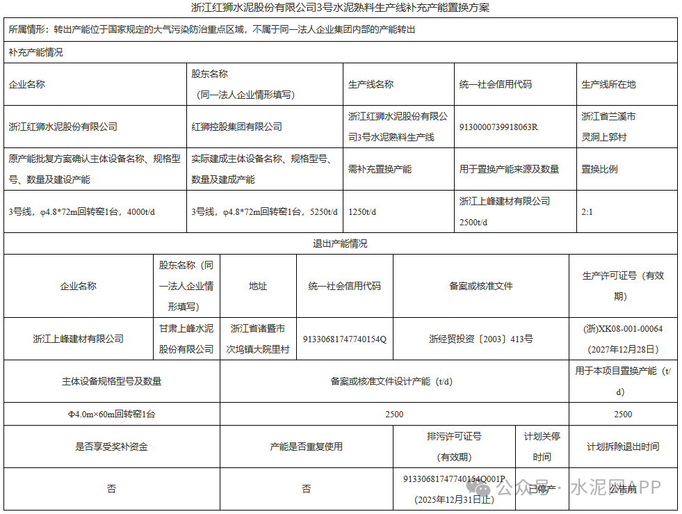 置換方案顯示,浙江紅獅水泥股份有限公司3號線需補充置換產(chǎn)能1250t/d,生產(chǎn)線產(chǎn)能由補充前4000t/d到補充后5250t/d。退出的2500t/d產(chǎn)能來自浙江上峰建材有限公司,置換比例2:1。