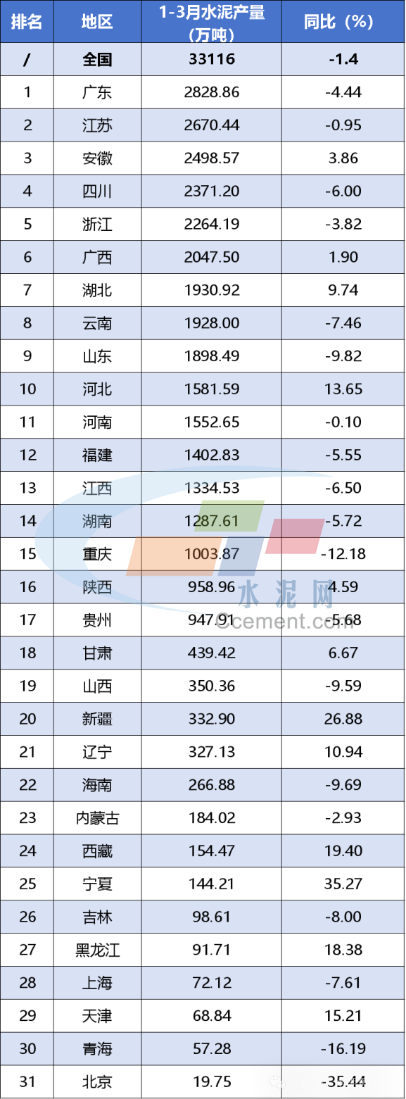 國(guó)家統(tǒng)計(jì)局?jǐn)?shù)據(jù)顯示,2025年3月水泥產(chǎn)量為1.58億噸,同比增長(zhǎng)2.5%;2025年1-3月水泥產(chǎn)量為3.31億噸,同比下降1.4%。