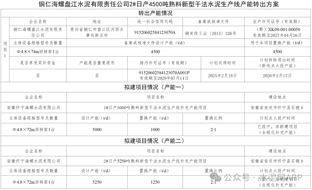 轉(zhuǎn)出產(chǎn)能:銅仁海螺盤江水泥2#4500t/d置換補(bǔ)充產(chǎn)能:安徽懷寧海螺1#1000t/d;2#1250t/d置換比例:2:1
