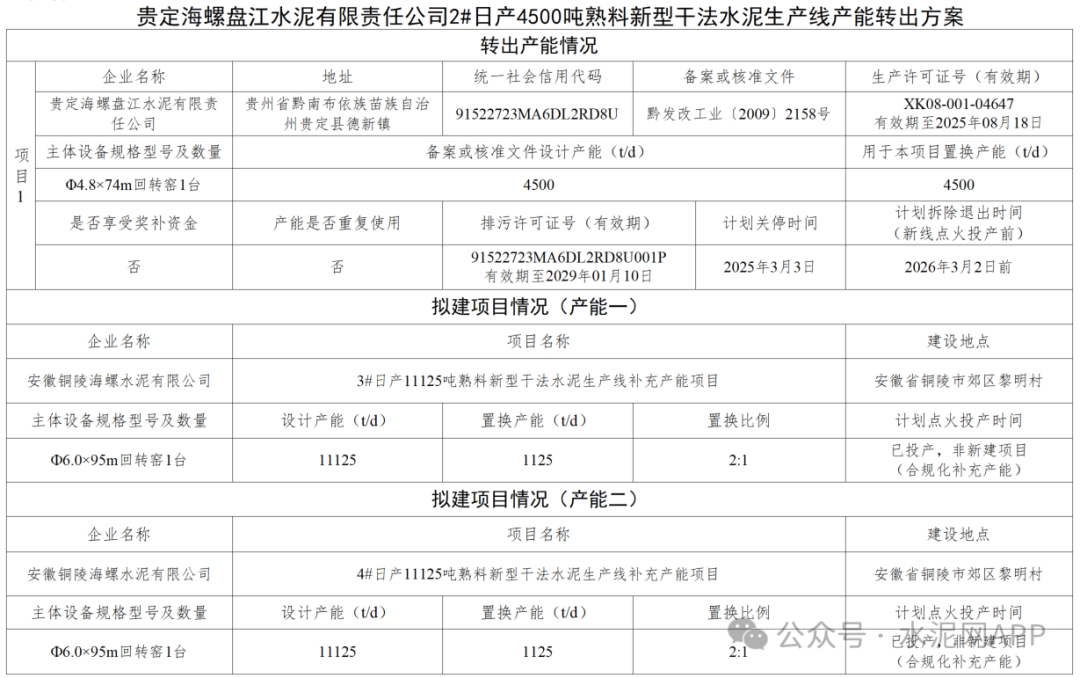 轉(zhuǎn)出產(chǎn)能:貴定海螺盤江2#4500t/d置換補(bǔ)充產(chǎn)能:安徽銅陵海螺水泥3#1125t/d;4#1125t/d置換比例:2:1