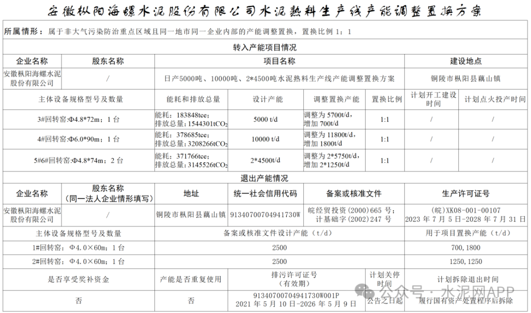 轉(zhuǎn)出產(chǎn)能:安徽樅陽海螺1#2500t/d;2#2500t/d置換補(bǔ)充產(chǎn)能:安徽樅陽海螺3#700t/d;4#1800t/d;5#1250t/d;6#1250t/d置換比例:1:1