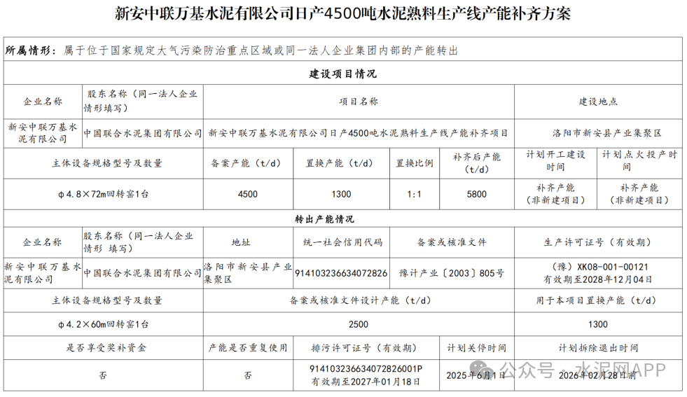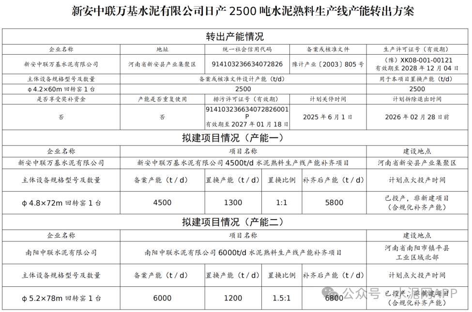 內(nèi)容顯示,新安中聯(lián)萬(wàn)基水泥4500t/d熟料生產(chǎn)線置換補(bǔ)充產(chǎn)能1300t/d,補(bǔ)充后產(chǎn)能為5800t/d,出讓產(chǎn)能來(lái)自同公司2500t/d熟料生產(chǎn)線,用于本產(chǎn)能1300t/d,置換比例1:1;剩余1200t/d熟料產(chǎn)能用于補(bǔ)充南陽(yáng)中聯(lián)6000t/d熟料生產(chǎn)線,補(bǔ)充后南陽(yáng)中聯(lián)生產(chǎn)線產(chǎn)能達(dá)到6800t/d,置換比例1.5:1。
