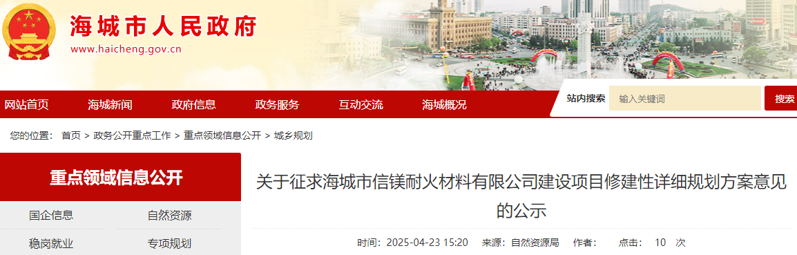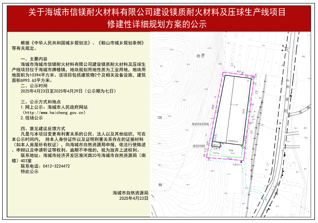 為切實增強(qiáng)規(guī)劃的科學(xué)性、合理性和可行性,征求公眾意見,根據(jù)《中華人民共和國城鄉(xiāng)規(guī)劃法》第二十六條規(guī)定,現(xiàn)將海城市信鎂耐火材料有限公司建設(shè)項目修建性詳細(xì)規(guī)劃方案內(nèi)容公告如下: