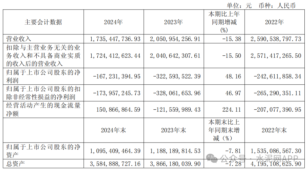 4月21日,福建水泥公布2024年年報(bào),公司營(yíng)業(yè)收入為17.4億元,同比下降15.4%;歸屬于上市公司股東的凈利潤(rùn)-1.67億元,去年同期虧損3.23億元。