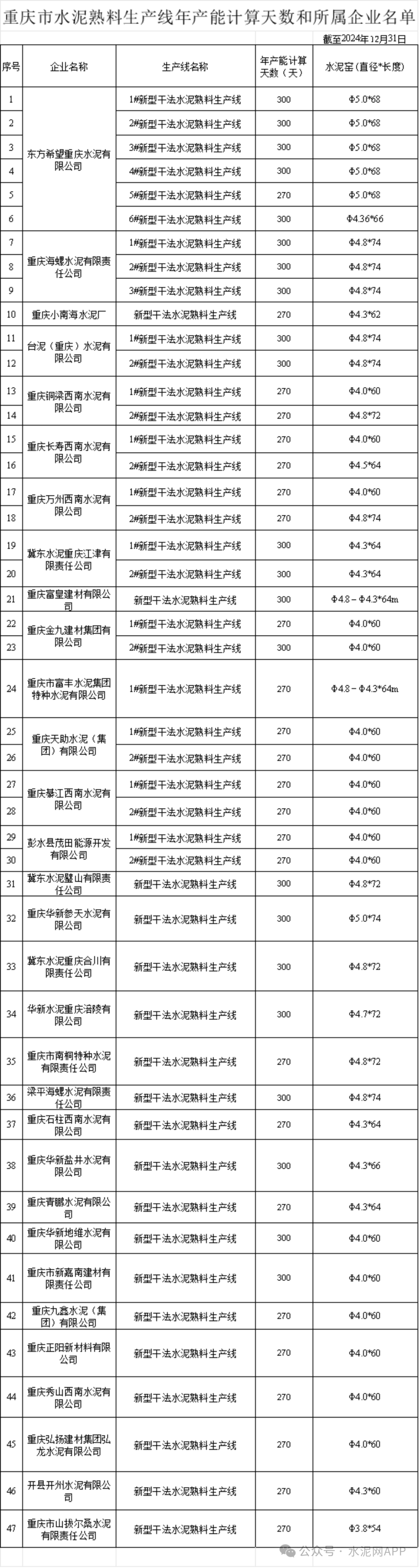 4月24日,重慶市經(jīng)濟和信息化委員會發(fā)布關(guān)于重慶市水泥熟料生產(chǎn)線年產(chǎn)能計算天數(shù)和所屬企業(yè)名單的公示。