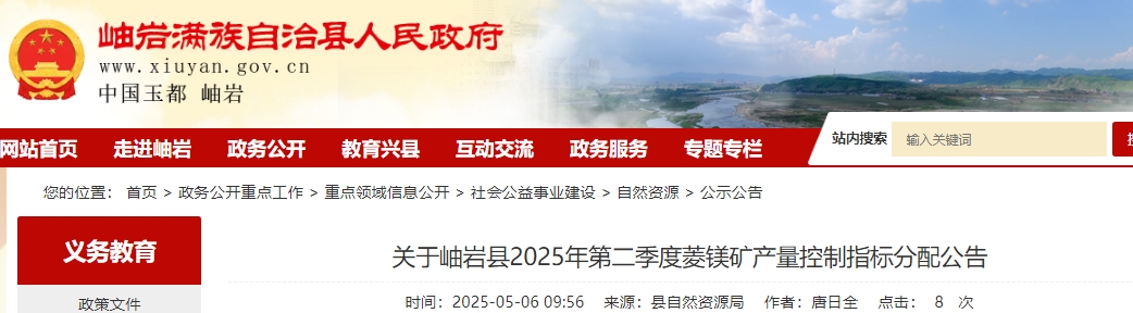 根據(jù)鞍山市菱鎂產(chǎn)業(yè)發(fā)展工作專(zhuān)班《關(guān)于下達(dá)鞍山市2025年第2季度菱鎂礦產(chǎn)量控制指標(biāo)的通知》(鞍鎂專(zhuān)班〔2025〕2號(hào)),現(xiàn)對(duì)岫巖縣2025年第二季度菱鎂礦產(chǎn)量控制指標(biāo)分配情況予以公告。