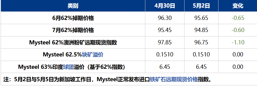 截止到5月4日,今年五一小長(zhǎng)假假期內(nèi)進(jìn)口鐵礦石市場(chǎng)整體表現(xiàn)較為冷清,海外掉期處于窄幅震蕩的狀態(tài)。而價(jià)格指數(shù)因?yàn)殡S著從主力月的變換則出現(xiàn)了下跌,其中Mysteel62%澳洲粉礦遠(yuǎn)期現(xiàn)貨指數(shù)在5月2日為96.75美元/干噸,相較于4月30日97.85美元/干噸下跌1.10美元/干噸,跌幅約為1.12%。