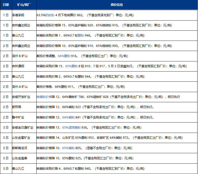 五一假期期間,鋼企國(guó)內(nèi)鐵精粉按需少量采購(gòu),受外盤(pán)市場(chǎng)下行影響,壓價(jià)心態(tài)明顯,整體市場(chǎng)偏弱運(yùn)行。假期期間部分鋼企、礦山調(diào)價(jià)信息如下: