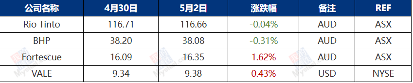 三、五一假期期間海外四大礦山股市波動(dòng)