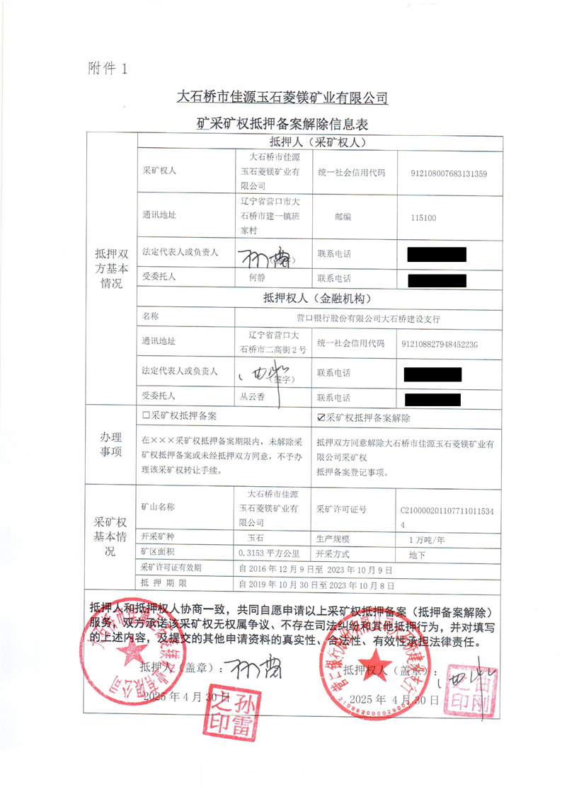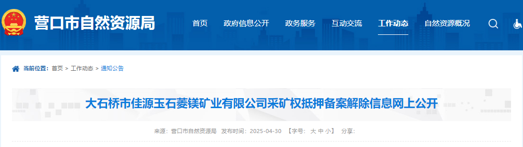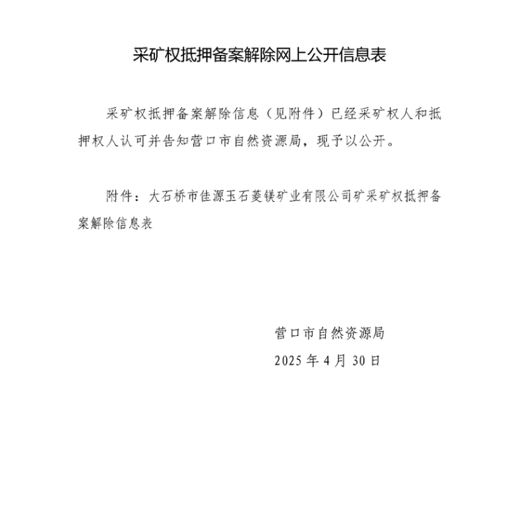大石橋市佳源玉石菱鎂礦業(yè)有限公司采礦權抵押備案解除信息網(wǎng)上公開