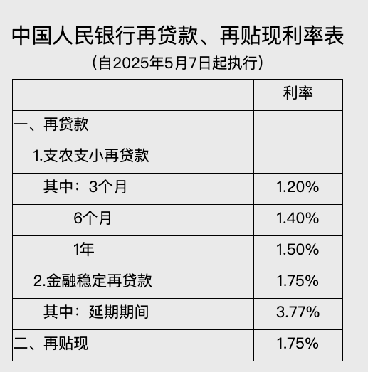 央視網(wǎng)消息:5月7日,中國人民銀行公布再貸款、再貼現(xiàn)利率表:3個月、6個月和1年期支農支小再貸款利率分別為1.2%、1.4%和1.5%,金融穩(wěn)定再貸款利率為1.75%,其中延期期間為3.77%,再貼現(xiàn)利率為1.75%。