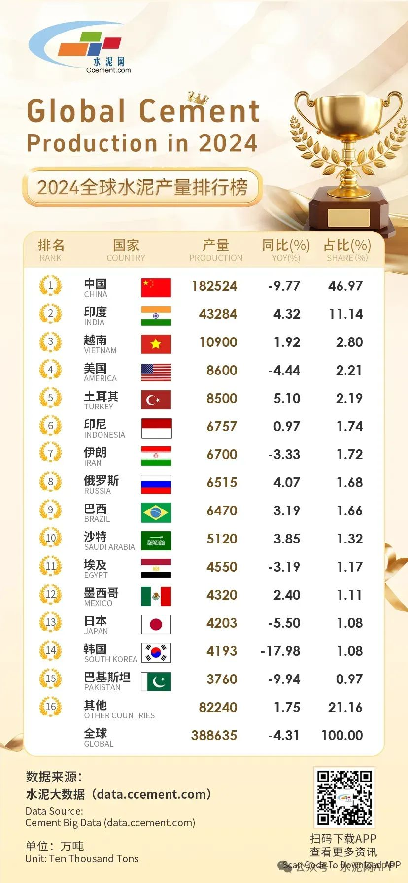 根據(jù)榜單顯示,2024年全球水泥產(chǎn)量38.86億噸,同比下降4.31%;中國以18.25億噸的水泥產(chǎn)量,自1985年以來,連續(xù)39年位居第一。