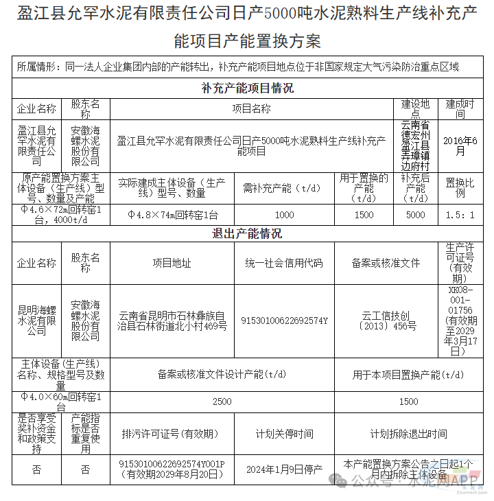 置換方案顯示,海螺水泥子公司盈江縣允罕水泥5000t/d熟料生產(chǎn)線項(xiàng)目補(bǔ)充1000t/d產(chǎn)能,置換比例1.5:1。退出的1500t/d產(chǎn)能來自昆明海螺水泥2500t/d熟料線。
