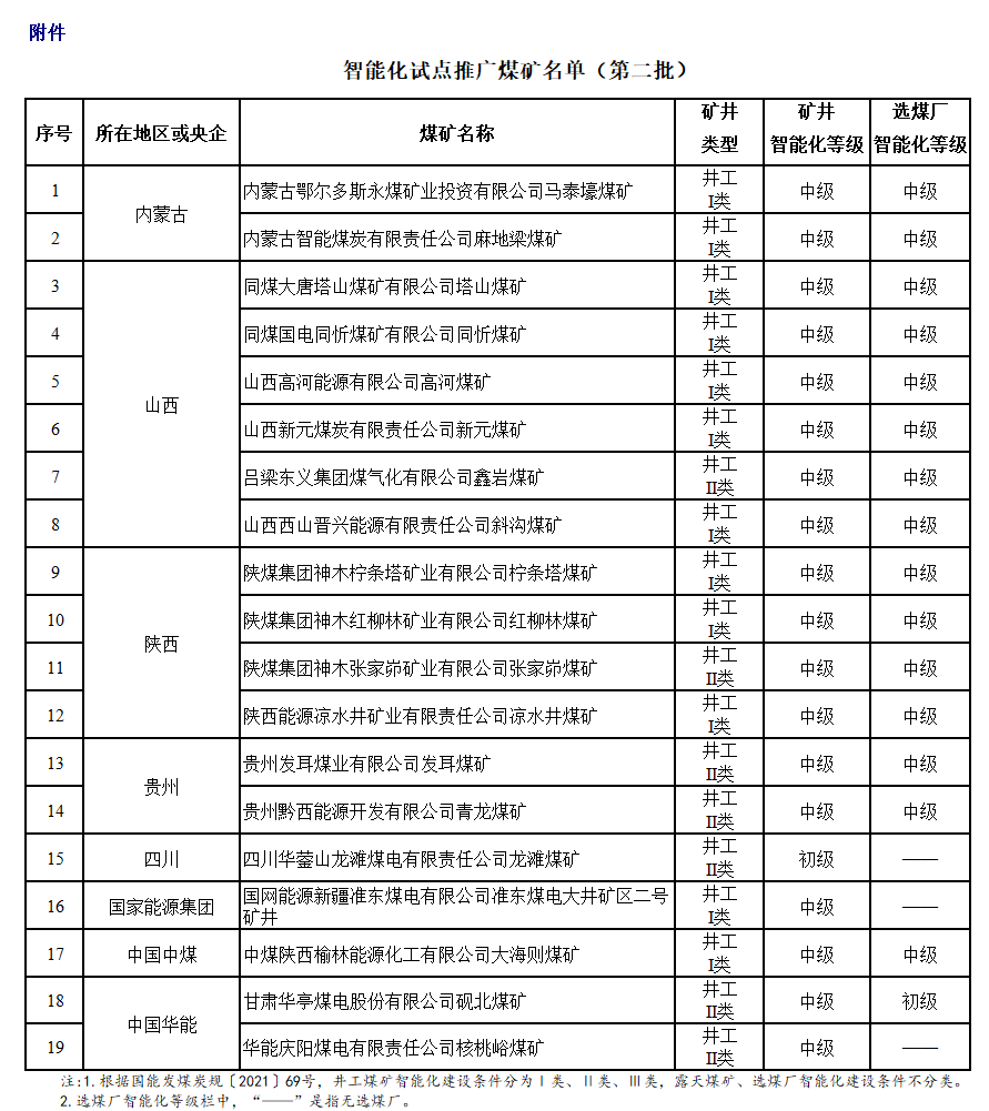 國家能源局綜合司關于第二批智能化試點推廣煤礦的公示