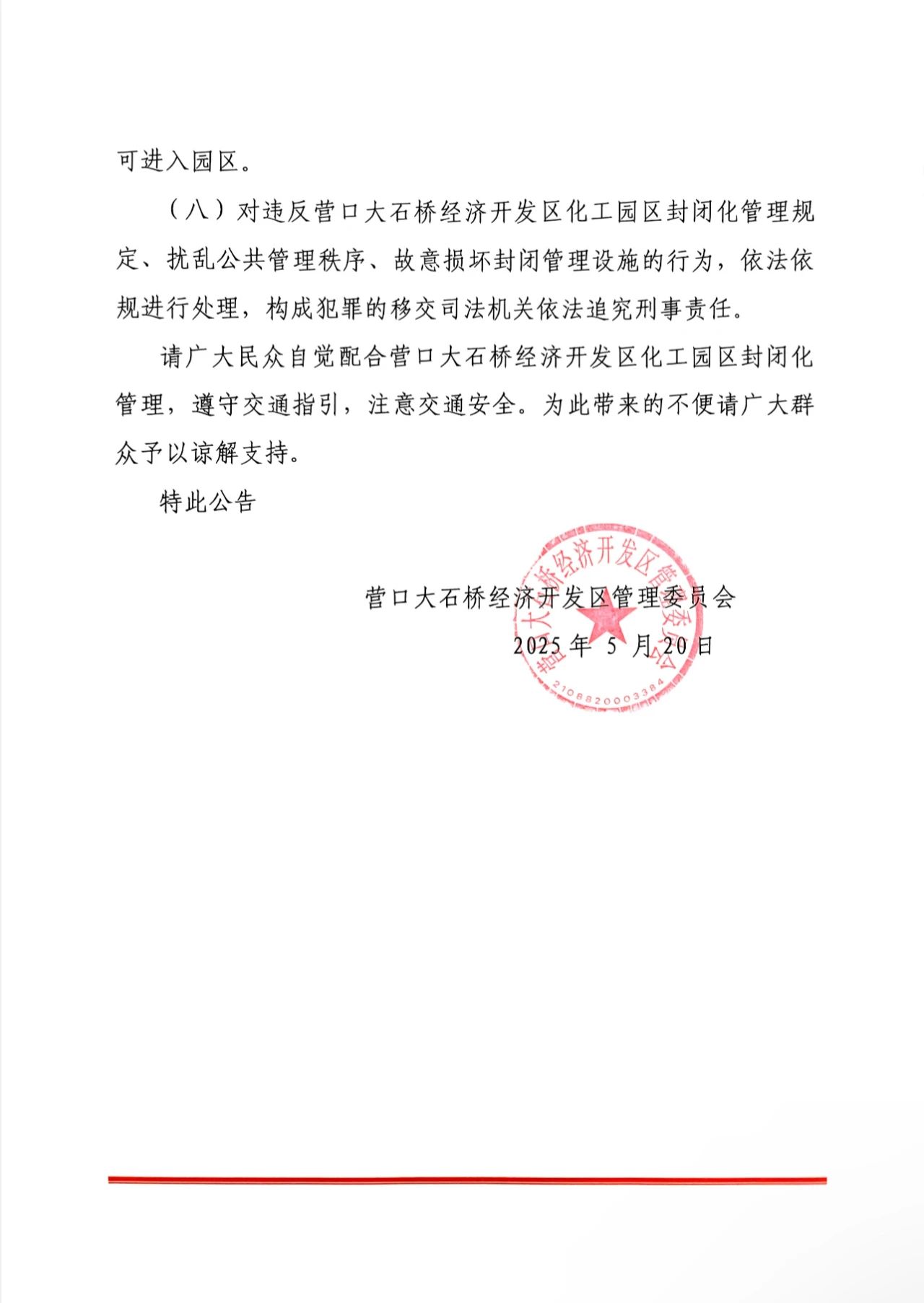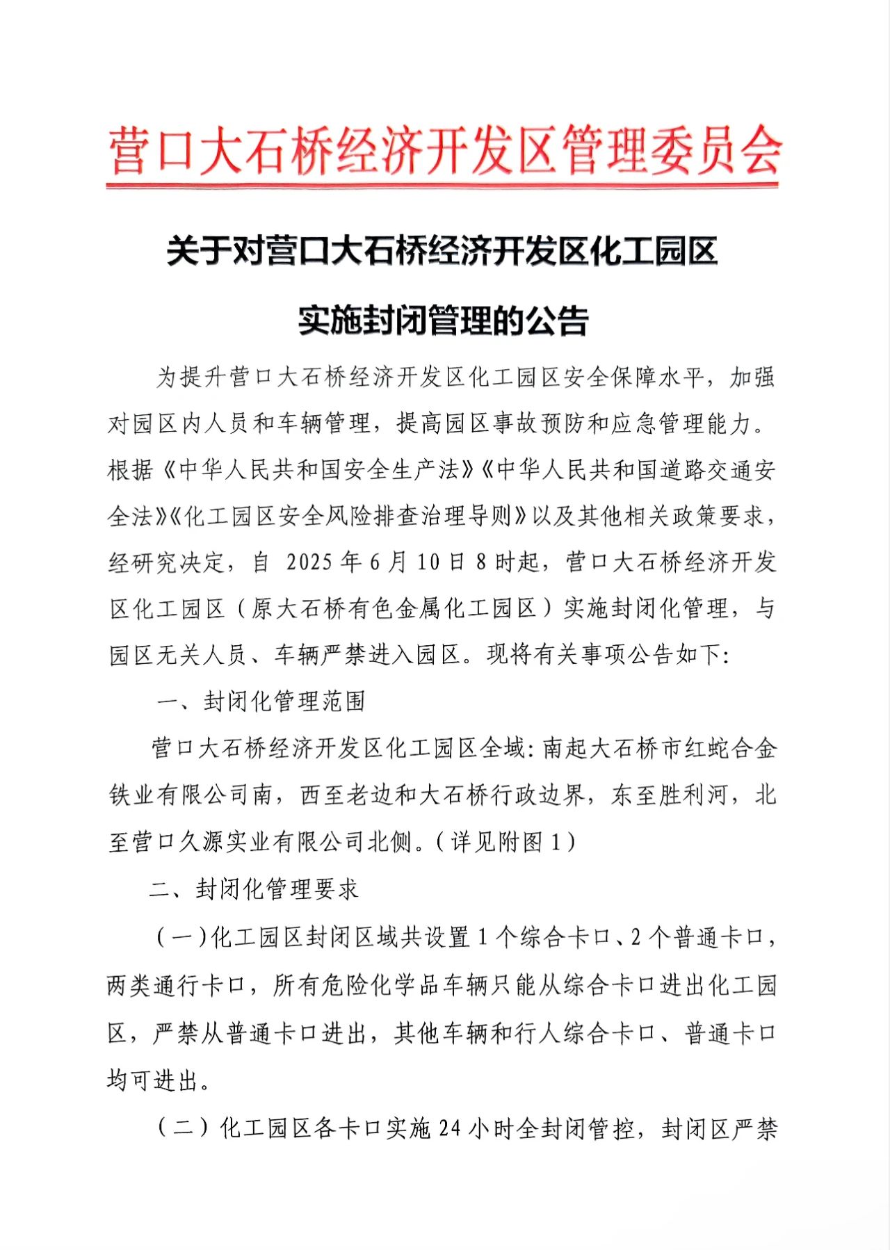 大石橋經(jīng)開區(qū)關(guān)于對(duì)營(yíng)口大石橋經(jīng)濟(jì)開發(fā)區(qū)化工園區(qū)實(shí)施封閉管理的公告