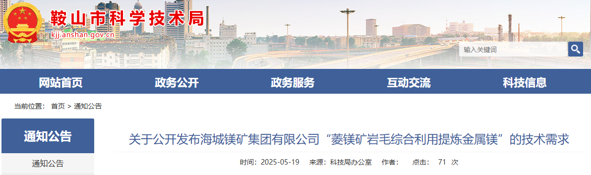 海鎂集團在菱鎂礦巖毛綜合利用提煉金屬鎂領域存在技術攻關需求,現(xiàn)誠邀掌握自主知識產權并具有良好的科研道德和社會誠信的高校院所和科研機構洽談合作。請有意向的單位將合作方案、團隊簡介等材料發(fā)送至指定郵箱或與海城市發(fā)改局聯(lián)系。