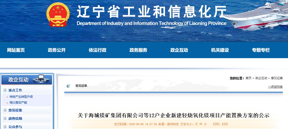 按照《遼寧省人民政府辦公廳關于推進菱鎂行業(yè)高質量發(fā)展的實施意見》(遼政辦發(fā)〔2023〕15號)、《遼寧省菱鎂礦浮選及鎂砂行業(yè)產(chǎn)能置換辦法》(遼工信建材〔2024〕18號)要求,根據(jù)菱鎂行業(yè)專項整治工作進展,經(jīng)企業(yè)申請、市工信部門初審、我廳審核,現(xiàn)將海城鎂礦集團有限公司等12戶企業(yè)新建輕燒氧化鎂項目產(chǎn)能置換方案予以公示,公示期10個工作日。